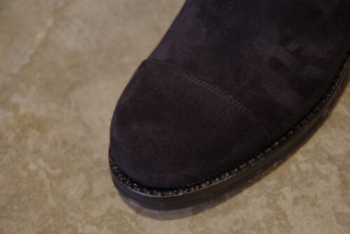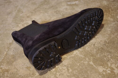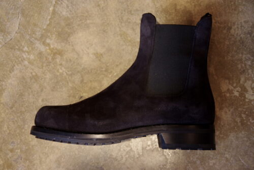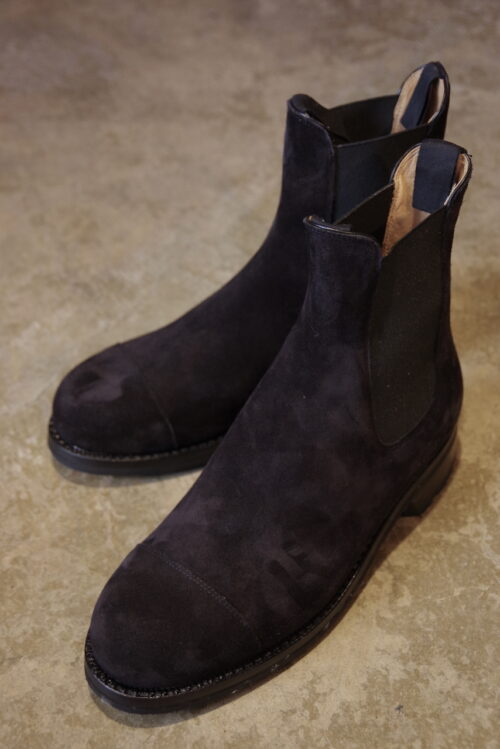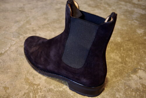 こちらは定番のストレートチップサイドゴアブーツをブラックスエードでオーダーしたモデル。以前オーダーしましたゴートレザーよりもスタイリッシュ感が大幅にアップ。足元にニュアンスを感じさせる仕上がりとなりました。