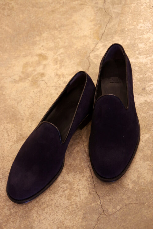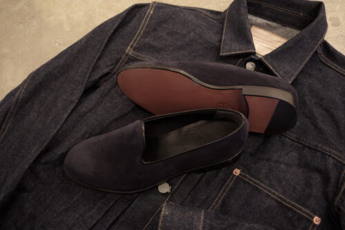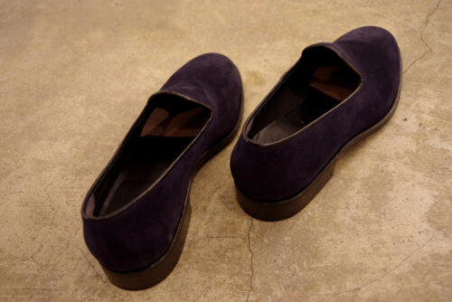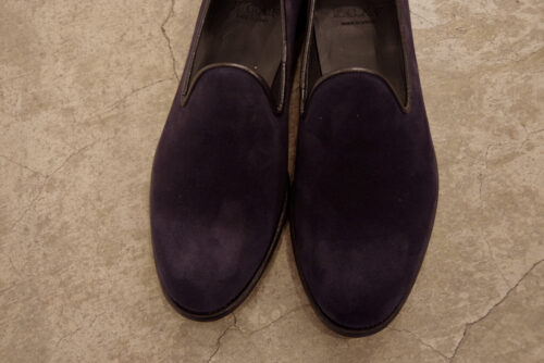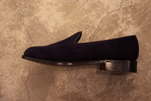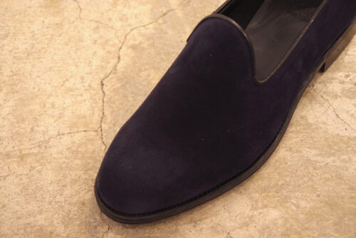 こちらはおなじみ英国SUPER BUCK社のスエード。カラーは青みを抑えたネイビーカラー。個人的に暑くなってもさらりと履けるレザースリッポンシューズが欲しくてオーダーしたアイテムです。