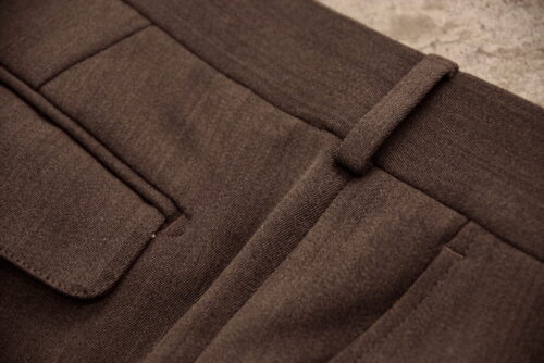こちらはウールストレッチのアーミーサージ。着用してみると揺れるようなしなやかさがあり、セミフレアーならではのドレープ感がとてもスタイリッシュに感じます。